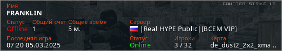 Играет на Counter Strike 1.6 сервере. Страна: РоссияПервый раз замечен 07:18 05.03.2025