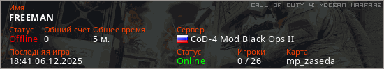 Играет на Call of Duty 4: Modern Warfare сервере. Страна: РоссияПервый раз замечен 18:35 06.12.2025