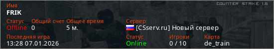Играет на Counter Strike 1.6 сервере. Страна: РоссияПервый раз замечен 13:09 07.01.2026
