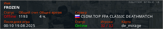 Играет на Counter Strike 1.6 сервере. Страна: РоссияПервый раз замечен 05:54 30.08.2022