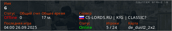 Играет на Counter Strike 1.6 сервере. Страна: РоссияПервый раз замечен 09:34 21.11.2024