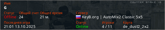 Последний раз был в сети 21:01 13.10.2025 Игрок с таким ником замечен на 40 серверах