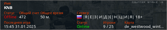 Играет на Counter Strike 1.6 сервере. Страна: РоссияПервый раз замечен 14:53 31.01.2025