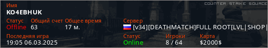 Играет на Counter Strike Source сервере. Страна: РоссияПервый раз замечен 00:13 19.12.2024