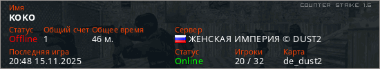 Последний раз был в сети 20:48 15.11.2025 Игрок с таким ником замечен на 28 серверах