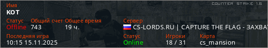 Играет на Counter Strike 1.6 сервере. Страна: РоссияПервый раз замечен 01:28 13.09.2021