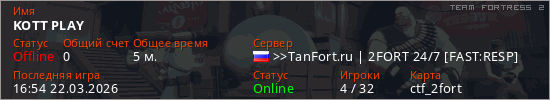 Играет на Team Fortress 2 сервере. Страна: РоссияПервый раз замечен 16:28 22.03.2026