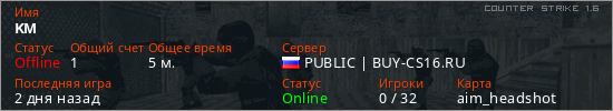 Играет на Counter Strike 1.6 сервере. Страна: РоссияПервый раз замечен 21:48 19.03.2026