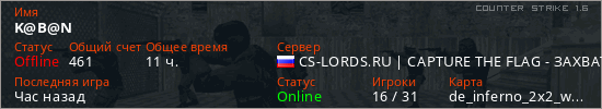Играет на Counter Strike 1.6 сервере. Страна: РоссияПервый раз замечен 19:50 18.07.2021