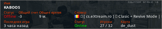 Играет на Counter Strike 1.6 сервере. Страна: РумынияПервый раз замечен 17:41 30.03.2026