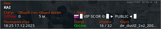 Играет на Counter Strike 1.6 сервере. Страна: РоссияПервый раз замечен 18:21 17.12.2025