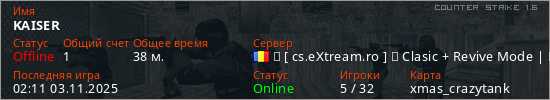 Играет на Counter Strike 1.6 сервере. Страна: РумынияПервый раз замечен 21:27 29.05.2025