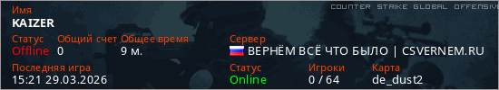 Играет на Counter Strike Global Offensive сервере. Страна: РоссияПервый раз замечен 15:10 29.03.2026
