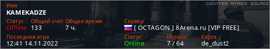 Играет на Counter Strike Source сервере. Страна: РоссияПервый раз замечен 13:13 18.11.2021