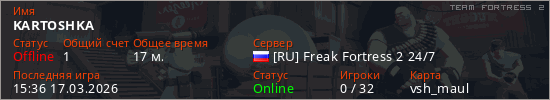 Играет на Team Fortress 2 сервере. Страна: РоссияПервый раз замечен 18:48 08.03.2026