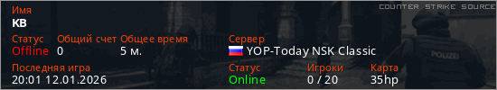 Играет на Counter Strike Source сервере. Страна: РоссияПервый раз замечен 19:59 12.01.2026