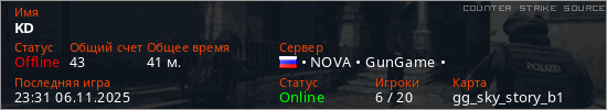 Играет на Counter Strike Source сервере. Страна: РоссияПервый раз замечен 17:23 28.05.2023