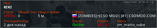 Играет на Counter Strike 1.6 сервере. Страна: РоссияПервый раз замечен 14:54 30.03.2026