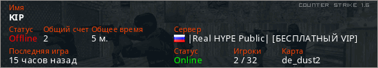 Играет на Counter Strike 1.6 сервере. Страна: РоссияПервый раз замечен 21:01 29.04.2026