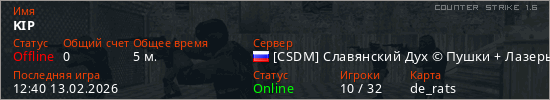 Играет на Counter Strike 1.6 сервере. Страна: РоссияПервый раз замечен 12:38 13.02.2026