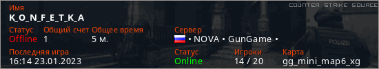 Играет на Counter Strike Source сервере. Страна: РоссияПервый раз замечен 16:12 23.01.2023