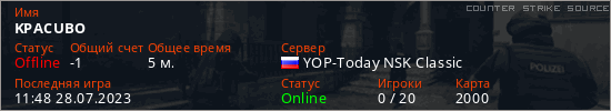 Играет на Counter Strike Source сервере. Страна: РоссияПервый раз замечен 11:46 28.07.2023
