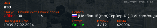 Играет на Counter Strike 1.6 сервере. Страна: РоссияПервый раз замечен 16:14 29.10.2022