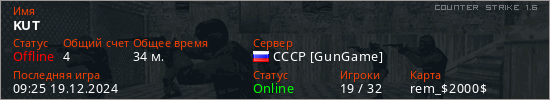 Играет на Counter Strike 1.6 сервере. Страна: РоссияПервый раз замечен 12:09 05.12.2024
