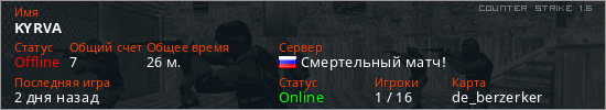 Играет на Counter Strike 1.6 сервере. Страна: РоссияПервый раз замечен 21:59 29.01.2026