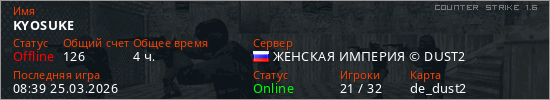 Играет на Counter Strike 1.6 сервере. Страна: РоссияПервый раз замечен 22:19 13.03.2026