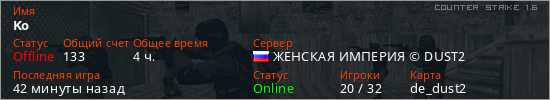 Играет на Counter Strike 1.6 сервере. Страна: РоссияПервый раз замечен 18:04 22.03.2026