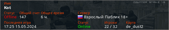Играет на Counter Strike 1.6 сервере. Страна: РоссияПервый раз замечен 18:35 23.09.2021