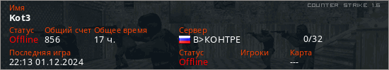 Играет на Counter Strike 1.6 сервере. Страна: РоссияПервый раз замечен 01:26 27.09.2021
