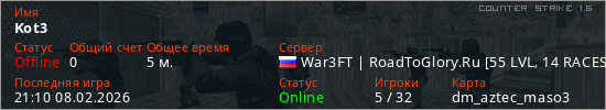 Играет на Counter Strike 1.6 сервере. Страна: РоссияПервый раз замечен 21:08 08.02.2026