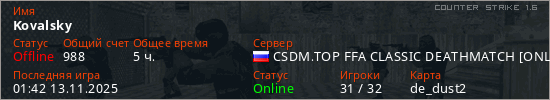 Играет на Counter Strike 1.6 сервере. Страна: РоссияПервый раз замечен 20:38 17.07.2022