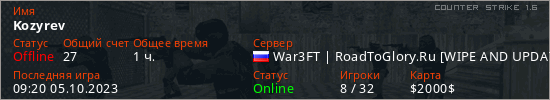 Играет на Counter Strike 1.6 сервере. Страна: РоссияПервый раз замечен 09:23 31.08.2023