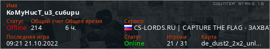 Играет на Counter Strike 1.6 сервере. Страна: РоссияПервый раз замечен 05:43 23.05.2022