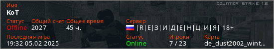 Последний раз был в сети 19:32 05.02.2025 Игрок с таким ником замечен на 31 сервере