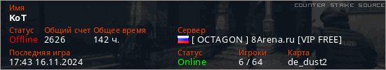Играет на Counter Strike Source сервере. Страна: РоссияПервый раз замечен 10:00 07.01.2020