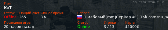 Последний раз был в сети 19 часов назад Игрок с таким ником замечен на 32 серверах