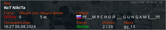 Последний раз был в сети 16:27 06.08.2024 Игрок с таким ником замечен на 9 серверах