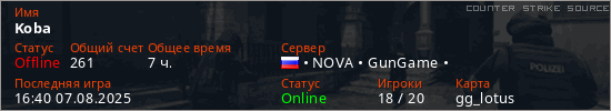 Играет на Counter Strike Source сервере. Страна: РоссияПервый раз замечен 17:09 16.06.2025