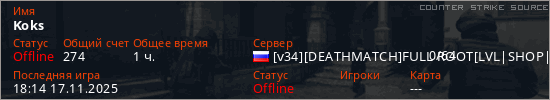 Играет на Counter Strike Source сервере. Страна: РоссияПервый раз замечен 21:12 11.06.2023