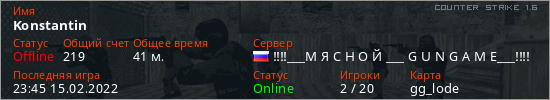 Играет на Counter Strike 1.6 сервере. Страна: РоссияПервый раз замечен 23:07 15.02.2022