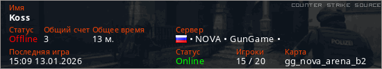 Играет на Counter Strike Source сервере. Страна: РоссияПервый раз замечен 18:56 10.01.2026