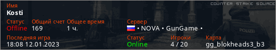 Играет на Counter Strike Source сервере. Страна: РоссияПервый раз замечен 15:51 04.12.2022