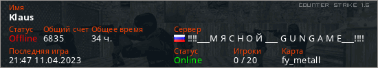 Последний раз был в сети 21:47 11.04.2023 Игрок с таким ником замечен на 23 серверах