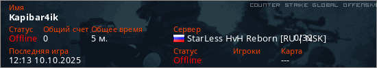 Играет на Counter Strike Global Offensive сервере. Страна: РоссияПервый раз замечен 11:49 10.10.2025