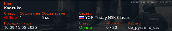 Играет на Counter Strike Source сервере. Страна: РоссияПервый раз замечен 15:50 15.08.2025