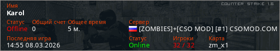 Играет на Counter Strike 1.6 сервере. Страна: РоссияПервый раз замечен 14:46 08.03.2026
